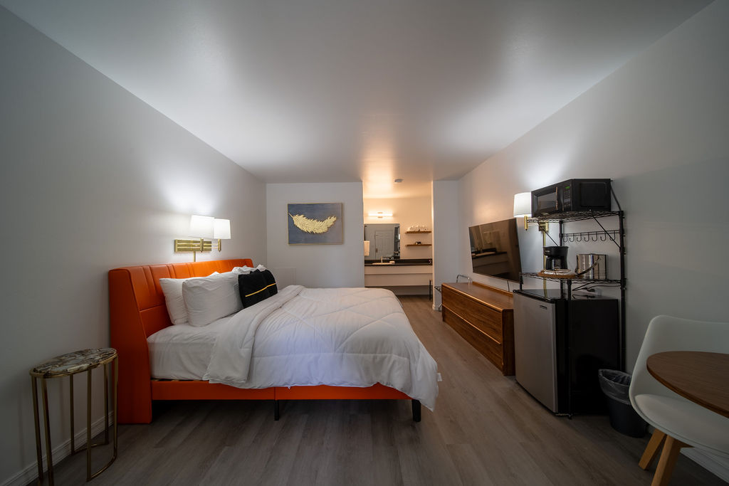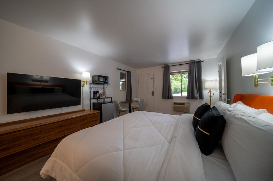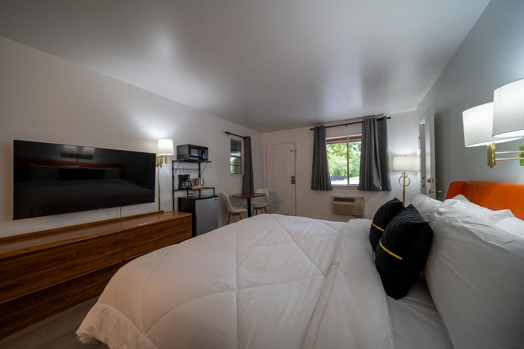 Featuring a king size bed, this room provides a cozy and inviting atmosphere during your visit. Has small sitting area, A/C, microwave, small fridge, and coffee maker. On the ground level.